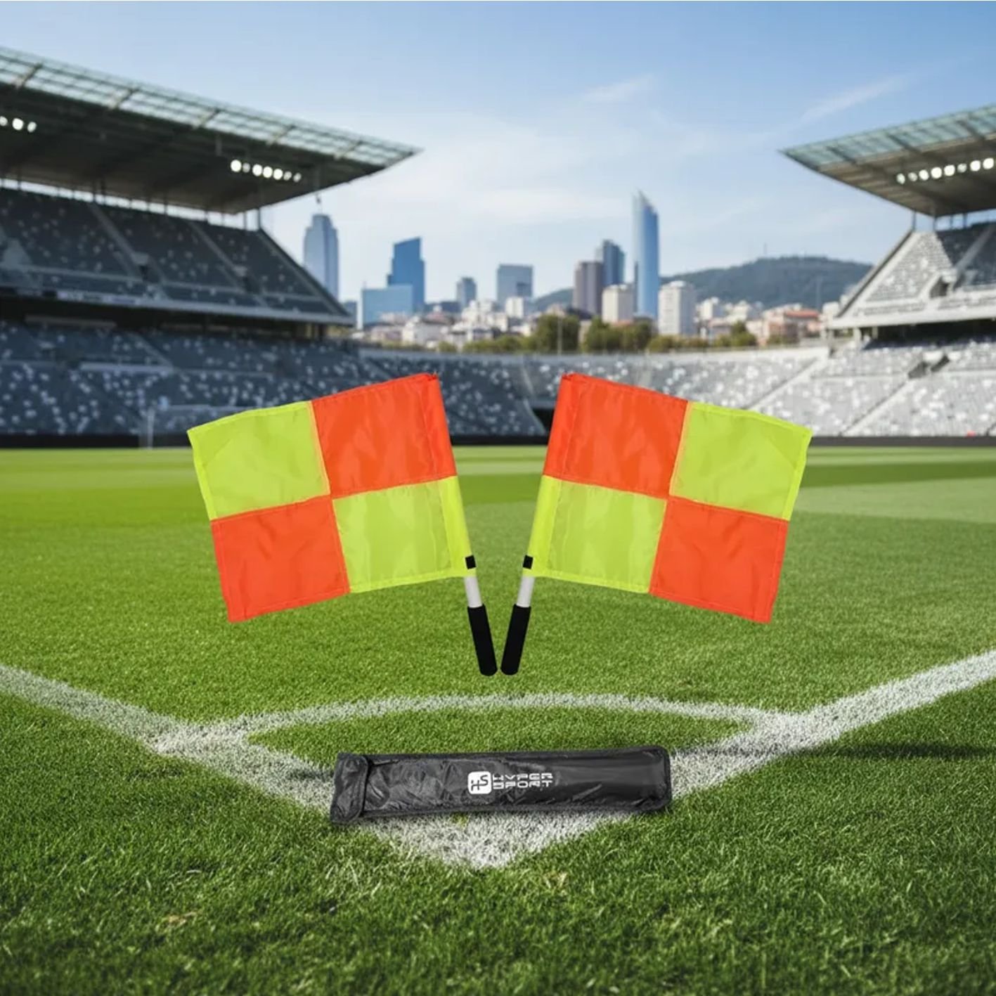 Este modelo é composto por duas bandeirinhas, permitindo uso simultâneo por árbitros auxiliares em jogos oficiais ou recreativos. Fabricadas com materiais resistentes, elas suportam o uso contínuo e as condições adversas do campo, como vento, chuva e sol intenso.