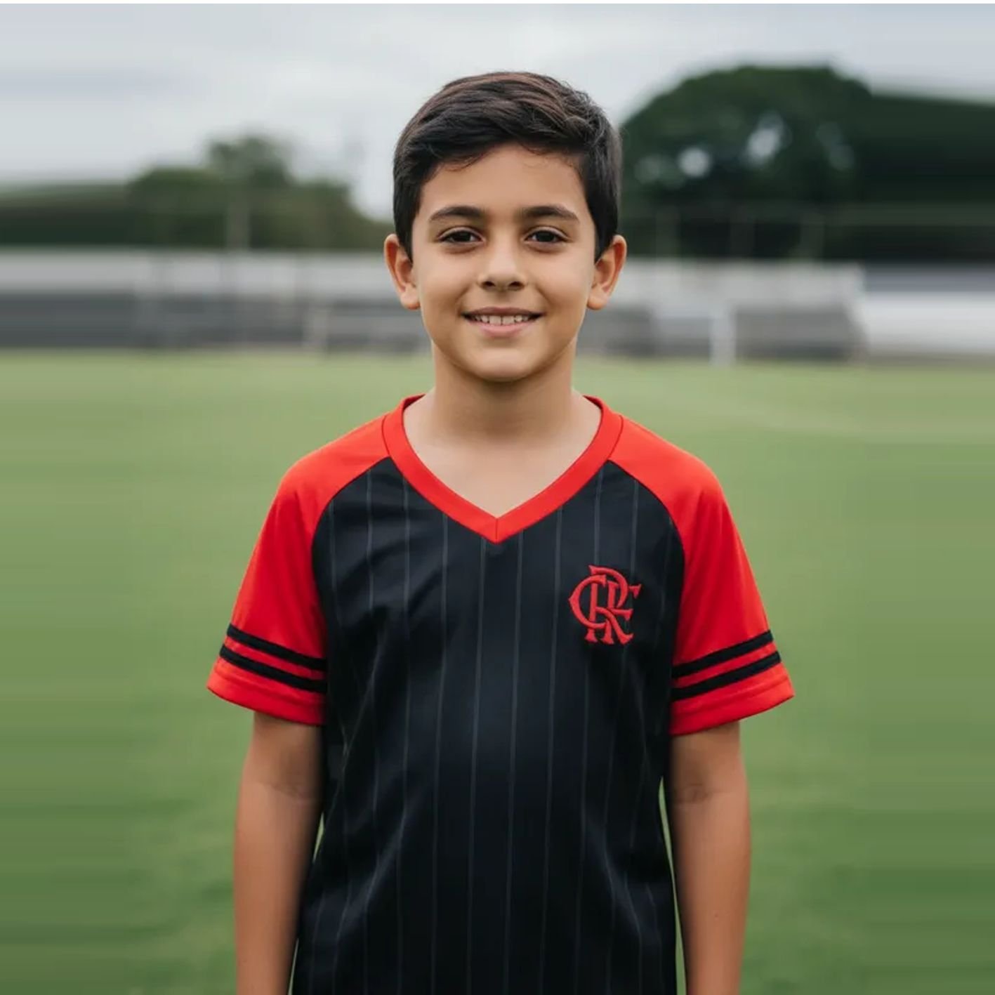 Escudo do Clube: O distintivo do Clube de Regatas do Flamengo é aplicado na altura do peito. A aplicação é realizada através de silk-screen (estampa resistente), garantindo a fidelidade e a durabilidade do escudo oficial.