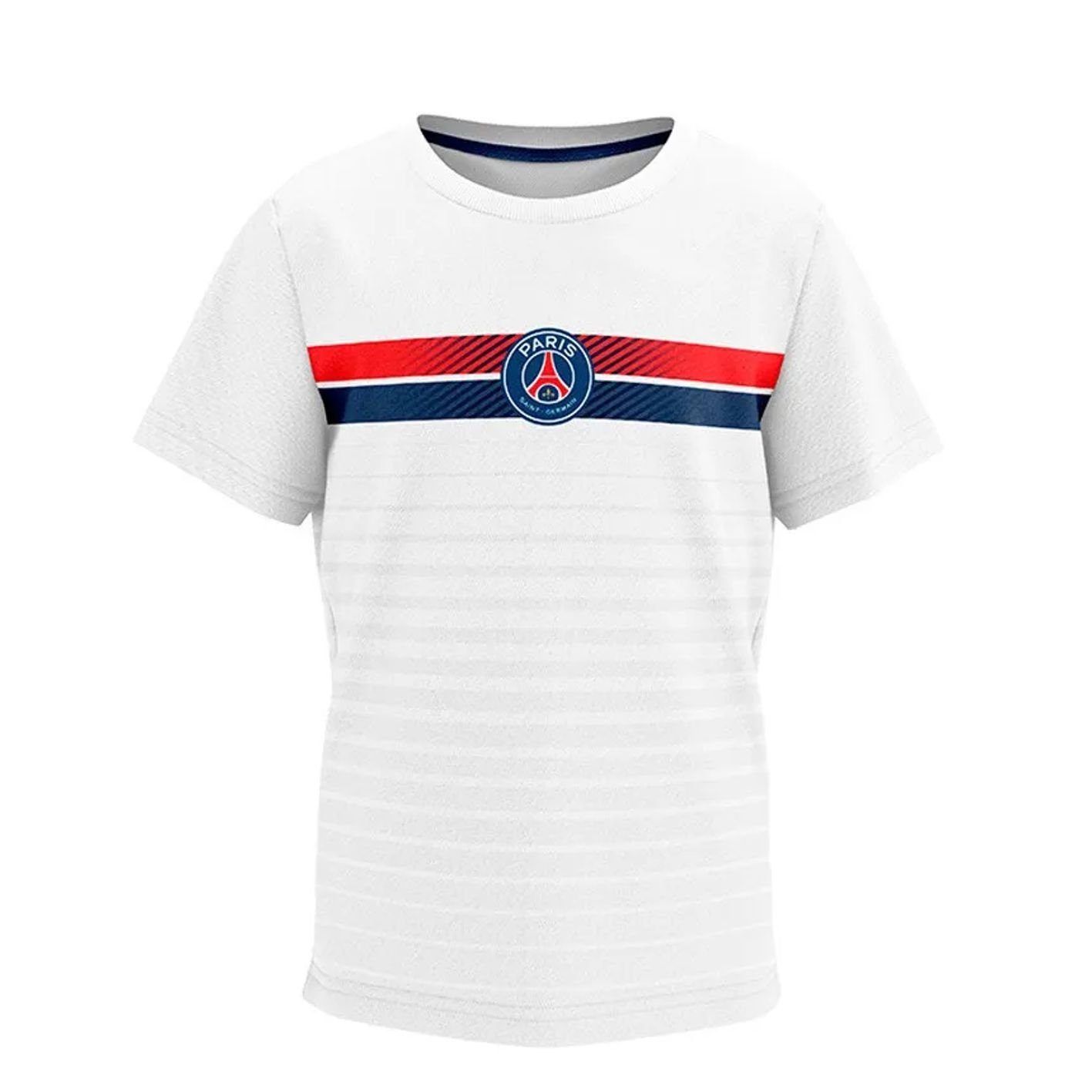 - Design: Gola careca, manga curta, escudo do Paris Saint-Germain estampado no peito, cor predominante branca