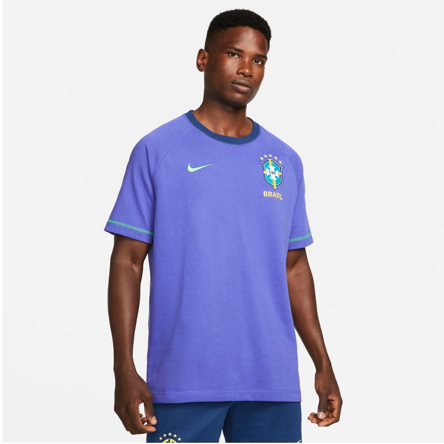 Inspirada no que os jogadores usam fora do campo, essa camiseta te dá aquela sensação de tecido fácil de usar em um caimento solto. Um brasão woven da seleção no peito deixa muito claro para quem você torce.