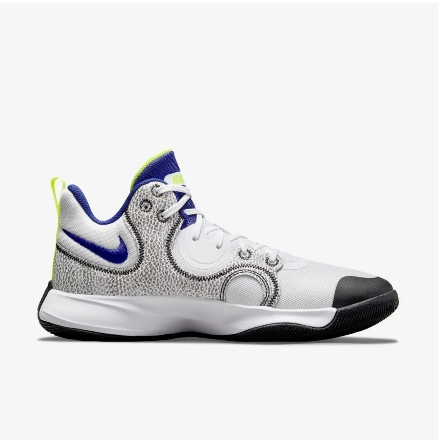 A tração em padrão espinha de peixe modificada com círculo pivot proporciona aderência à quadra e mudanças de direção ágeis.