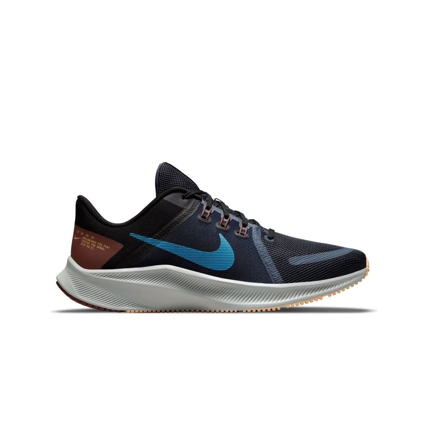 A língua forrada com tela se conecta ao forro interno da parte de cima para oferecer sensação de segurança. Na língua, há um logotipo alfanumérico que indica Nike Quest.