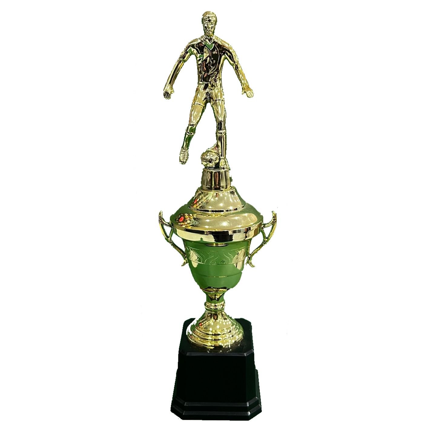 TROFÉU EM POLÍMERO METALIZADO A ALTO VÁCUO MEDIDAS: ALTURA – 38 cm. LARGURA SUPERIOR – 9 cm. LARGURA INFERIOR – 7,30 cm. ALTURA DA BASE- 5 cm. PESO APROXIMADO – 250 gr CORES – DOURADO, PRETO CORES ALTERNATIVAS: CONE, TAÇA COM ALÇAS, TAMPA E ESTATUETA SUPERIOR NAS CORES DOURADO OU PRATA. COMPOSIÇÃO: COMPONENTES FABRICADOS EM POLÍMERO: BASE OITAVADA, CONE, TAÇA COM ALÇAS E TAMPA, ESTATUETA SUPERIOR. OUTROS COMPONENTES: FERRAGENS PARA FIXAÇÃO